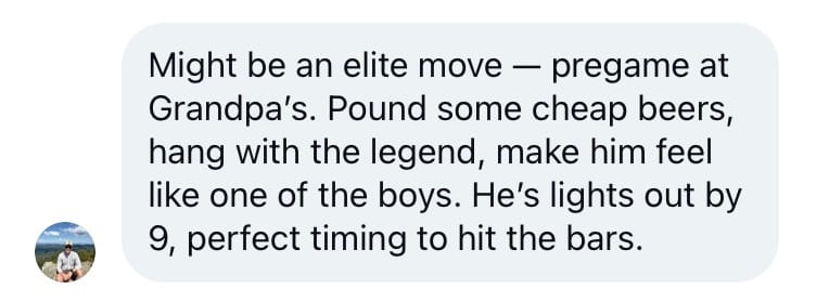 Wanted to take a moment and pay tribute to this elite Move. When joeh_2021 sent it over, I immediately replied, "Pregaming with the Gpa is all time." I know you can make the gag, "What if both Grandpas are dead?" Which, yeah. I mean, I'm in the same boat. And I think it's why this Move hits so hard. There's some serious realness attached to this puppy.